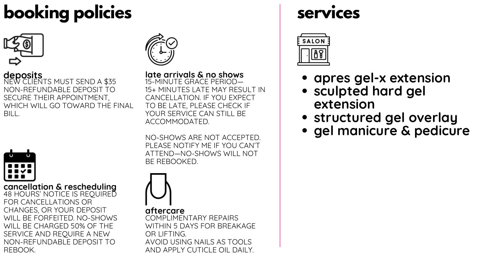 For scheduling and availability, please message me. Once you have reviewed the policies, we can proceed with booking your appointment.